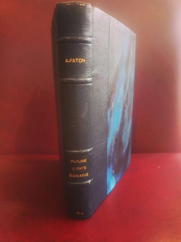 Paris, Albin Michel SD 1 in -8 demi chagrin bleu dos à caisson 339 [p.p] Le roman emblématique de la tragédie sud-africaine. À travers la quête d'un vieux pasteur zoulou partant à la recherche de son fils à Johannesburg, Alan Paton livre un témoignage universel sur la dignité humaine face à l'oppression. Un exemplaire magnifiquement établi dans une reliure en chagrin bleu dont l'élégance sobre convient parfaitement à la solennité du texte.