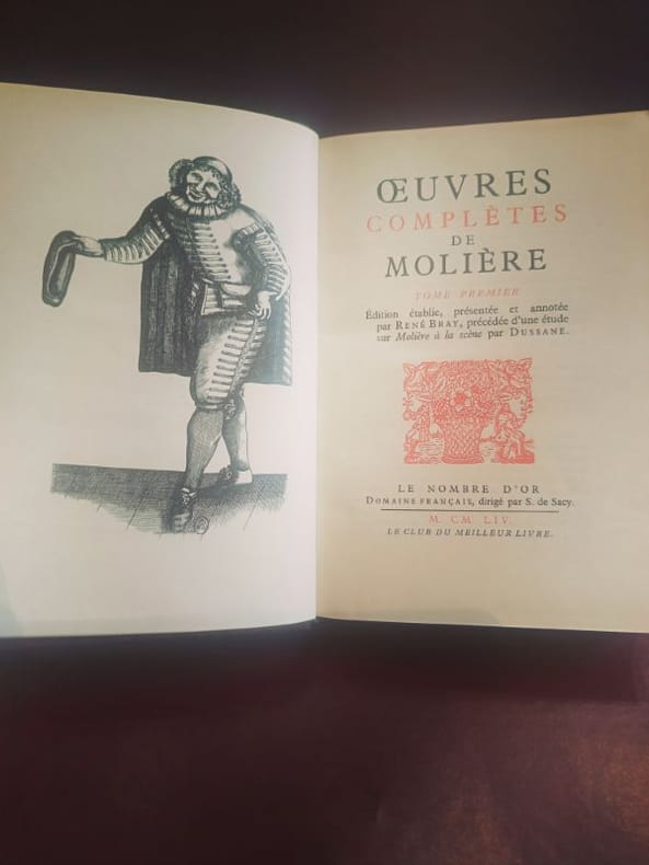 Paris, Le Club du meilleur livre 1954 3 in -8 plein cuir 1058 [p.p]1255 [p.p] Une édition de référence pour le théâtre de Molière, alliant l'élégance de la maquette moderne à la tradition du beau livre. Cette série de trois volumes, reliée en plein cuir, offre une prise en main exceptionnelle et une lisibilité parfaite. La numérotation de l'exemplaire garantit l'appartenance à un tirage restreint, faisant de cet ensemble un pilier indispensable pour toute bibliothèque classique exigeante.