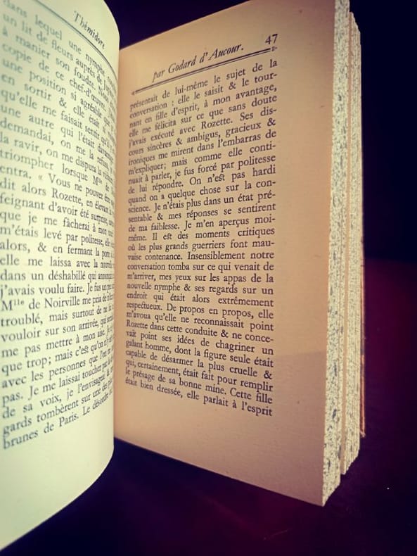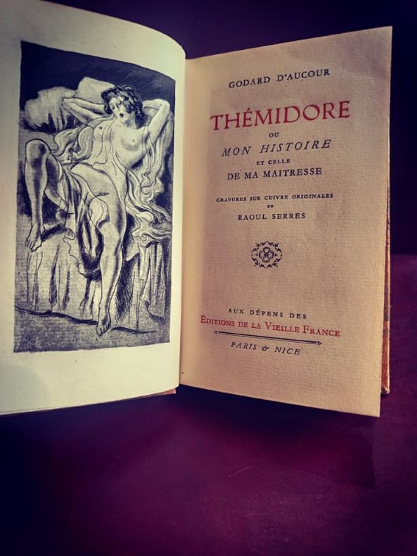 Nice, Editions de la vieille France 1950 1 In 12 plein cuir 254 [p.p] Publié initialement en 1744, Thémidore est un récit de formation amoureux où l'esprit et la chair se conjuguent avec une gaieté typiquement française. Raoul Serres livre ici une suite de cuivres d'une grande maîtrise technique, capturant l'élégance des corps et des décors du "Siècle de Louis XV".Bien que le titre mette en avant "ma maîtresse" comme un objet de récit, l'œuvre de Godard d'Aucour surprend par la modernité des rapports de désir. On y perçoit une forme de développement de l'intelligence émotionnelle : le protagoniste apprend à décrypter les masques sociaux et les subtilités du langage amoureux.Dans une optique de recherche de soi, ce texte illustre comment la curiosité (parfois perçue comme une forme de divergence cognitive) permet de s'affranchir des carcans moraux pour explorer la vérité des sentiments. Les gravures de Serres subliment cette quête par un trait d'une précision chirurgicale, presque "hyper-focalisée"