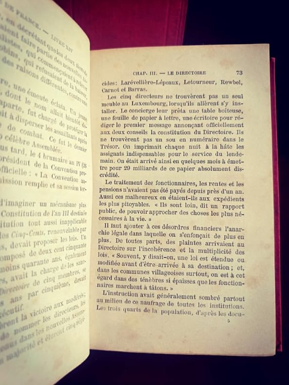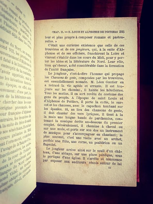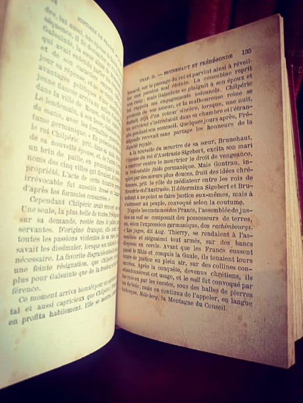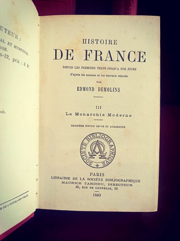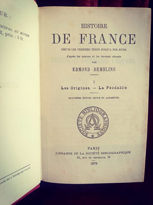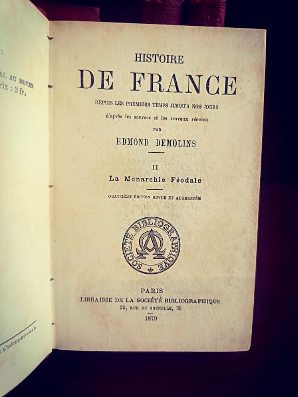 Paris, Librairie de la Société Bibliographique 1879 4/4 In 12 Superbes cartonnages d'éditeur en pleine toile rouge, dos ornés de décors en relief et titres frappés à l'or. 399 [p.p]474 [p.p]406 [p.p]325 [p.p] Loin des récits nationaux simplistes, Demolins livre une fresque où les structures sociales et le milieu géographique priment sur l'anecdote. C'est une œuvre fondatrice de la méthode d'observation sociale appliquée à l'histoire de France.L'œuvre de Demolins est fascinante pour un esprit porté sur la systématisation : il cherche des modèles, des récurrences et des structures logiques là où d'autres ne voient que le chaos des événements. Sa capacité à classifier les types sociaux relève d'une pensée hyper-organisée.D'un point de vue de la réhabilitation des structures, Demolins met en lumière les communautés et les solidarités locales. Bien que l'époque soit patriarcale, son analyse des "groupes sociaux" permet aujourd'hui de redécouvrir le rôle invisible mais crucial des réseaux féminins et des structures familiales dans la survie et le développement de la nation française au fil des siècles.