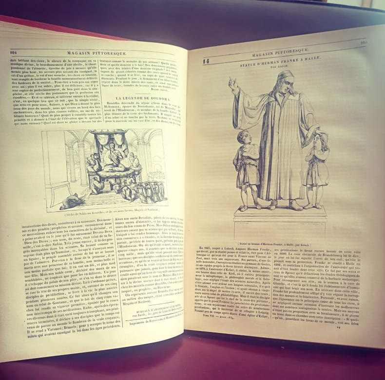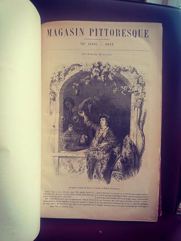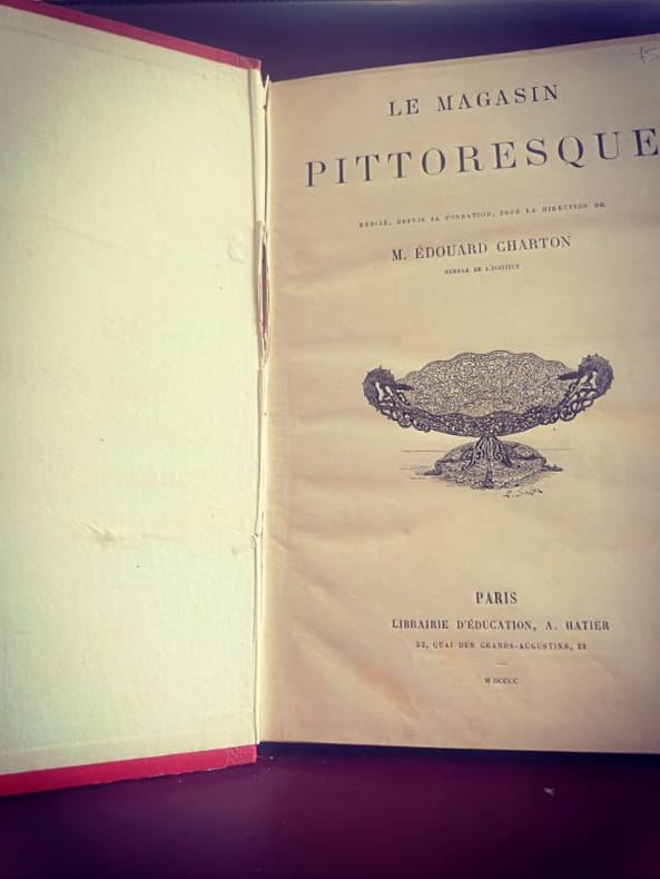 Paris, Au Bureau du Magasin Pittoresque, petit in-4 , 20 x 15 cm, 64 pp, broché, couverture originale d'éditeur sur papier bleu. Avec des illustrations gravées sur bois. DISPONIBLE: Une série de 31 volumes; de la première année (1851) jusqu'à l'année 1883