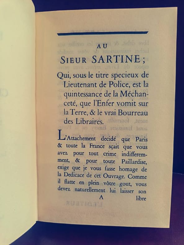 Sous étui et sous étui cartonnés. Reproduction de l'édition de 1771.Avec un second volume : "Histoire d'un livre traqué : Le Portier des Chartreux" par Pascal Pia, augmenté de nombreuses pièces inédites extraites des Archives de la Bastille et de 16 illustrations en noir et bleu.
