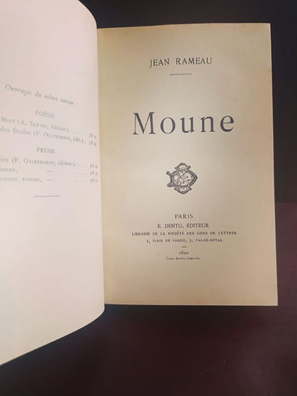 Paris E.Dentu 1890 1 in -8 demi chagrin, pièce de titre 355 [p.p] Moune de Jean Rameau, dans sa rare version illustrée chez Dentu. Un exemplaire miraculeusement préservé, d'une blancheur absolue et sans aucune rousseur, protégé par une élégante reliure en demi-chagrin. La rencontre idéale entre l'art de l'illustration fin-de-siècle et une conservation muséale. Une opportunité rare pour les collectionneurs les plus pointilleux.