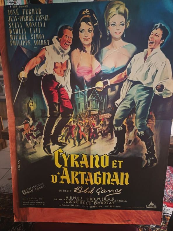 1964 LES DEUX LAMES DU PANACHE : Affiche originale (1964) du film Cyrano et d'Artagnan. Le testament épique d'Abel Gance mis en lumière par le dessin magistral de G. Allard. Une composition d'une rare élégance, réunissant les deux figures tutélaires de l'esprit français. Présentée dans un état exceptionnel, cette affiche est un hommage vibrant à la splendeur du cinéma de Cape et d'Épée.