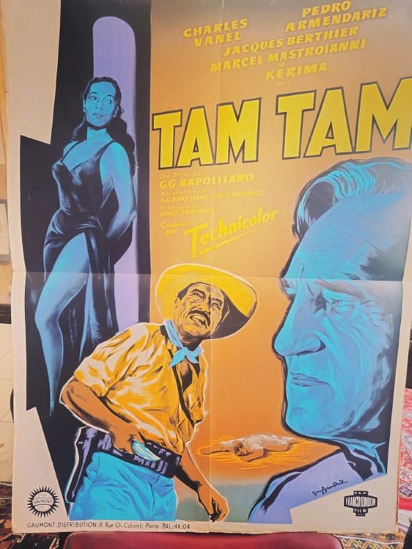 Paris Ets St Martin 60x80 LA NUIT DES SENS : Affiche originale (EO) du film Tam Tam. Dans une composition magistrale signée Guy Gérard Noël, le bleu devient le théâtre de la passion et du crime. Entre la menace du couteau et le magnétisme d'une présence féminine, cette œuvre sature l'espace d'un mystère insondable. Une pièce rare, d'une modernité graphique saisissante, pour les collectionneurs d'esthétique noire.