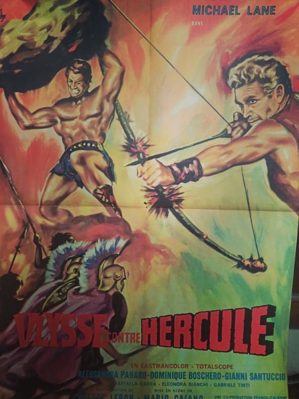 1962 60 x 80 LE CHOC DES TITANS : Affiche originale (1962) du film Ulysse contre Hercule. Mario Caiano orchestre l'affrontement épique entre l'intelligence et la puissance. Une composition graphique d'une intensité rare, capturant toute la démesure de la mythologie grecque. Présentée dans un état de conservation irréprochable, cette affiche est une pièce maîtresse pour tout collectionneur de l'âge d'or du péplum.