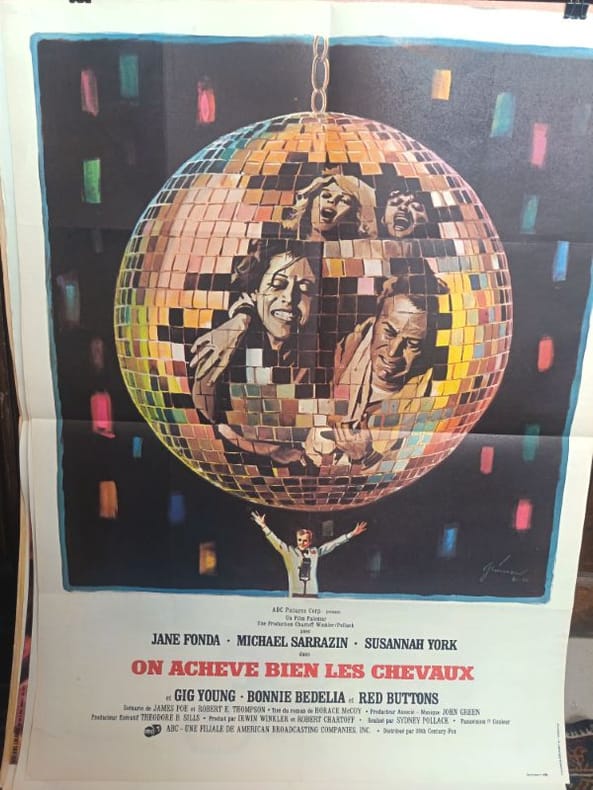 1969 60 x 80 LA DANSE DE L'ABÎME : Affiche originale (1969) du chef-d'œuvre de Sydney Pollack, On achève bien les chevaux. Jane Fonda incarne la révolte et l'épuisement dans cette fresque magistrale sur la dignité humaine. Une composition graphique d'une force rare, reflet d'un cinéma sans concession. Présentée dans un état exceptionnel, cette affiche est un témoignage poignant d'une œuvre culte qui a marqué l'histoire du cinéma mondial
