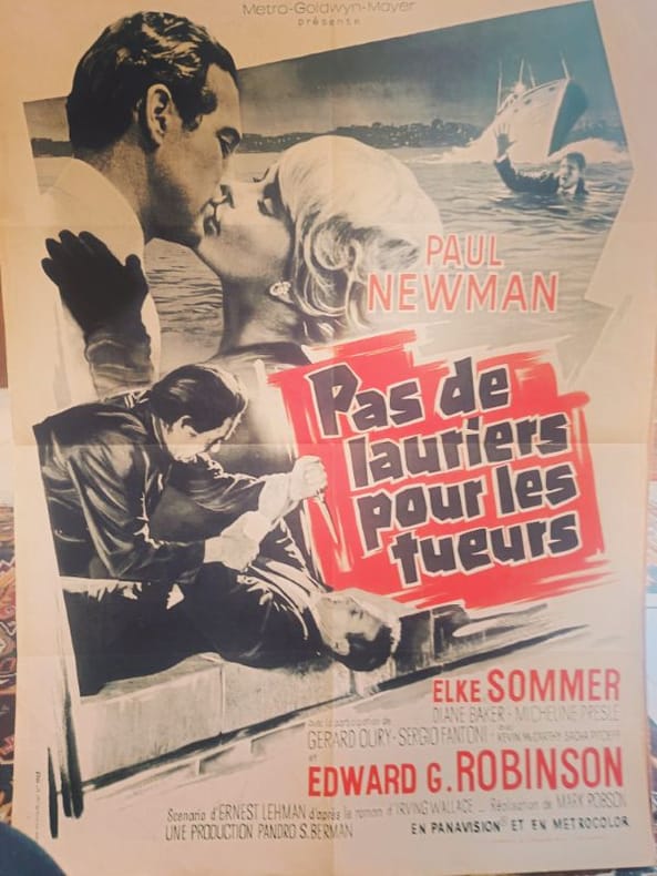 1963 60 x 80 NOBEL POUR UN MEURTRE : Affiche originale (1963) du film Pas de lauriers pour les tueurs. Paul Newman mène l'enquête au cœur de Stockholm dans ce thriller d'espionnage magistral signé Mark Robson. Une composition graphique élégante et tendue, où le glamour d'Elke Sommer rencontre le mystère d'une intrigue internationale. Présentée dans un état exceptionnel, cette affiche est un hommage au suspense de haut vol et au charisme souverain des grandes icônes des années 60.