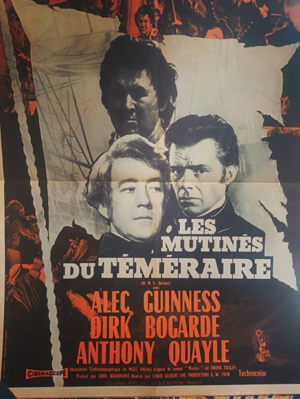 1962 60 x 80 LA RÉVOLTE DU SANG-FROID : Affiche originale (1962) du film Les Mutinés du Téméraire. Le duel légendaire entre Alec Guinness et Dirk Bogarde prend vie dans cette fresque navale implacable. Une composition graphique d'une grande force visuelle, illustrant l'honneur et la révolte au cœur des tempêtes du XVIIIe siècle. Présentée dans un état exceptionnel, cette affiche est un hommage indispensable au grand cinéma d'aventure historique.