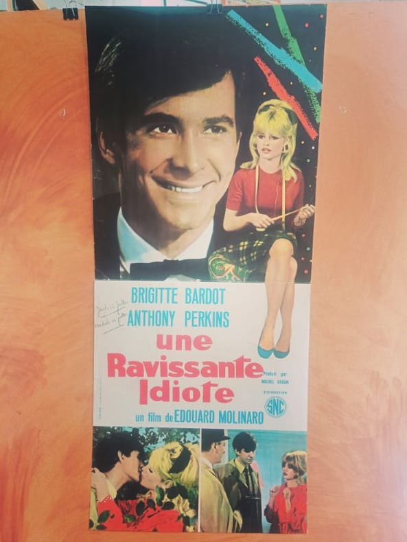 1964 70 x 30 L'ESPIONNE DE CHARME : Rare affiche originale (1964) au format vertical (70x30) du film Une ravissante idiote. La rencontre explosive entre l'irrésistible Brigitte Bardot et l'énigmatique Anthony Perkins dans une comédie d'espionnage d'une élégance absolue. Une composition élancée, mettant en valeur le magnétisme souverain de ses interprètes. Présentée dans un état de conservation proche du neuf, cette affiche est une pièce de collection d'une rareté et d'un raffinement exceptionnels.