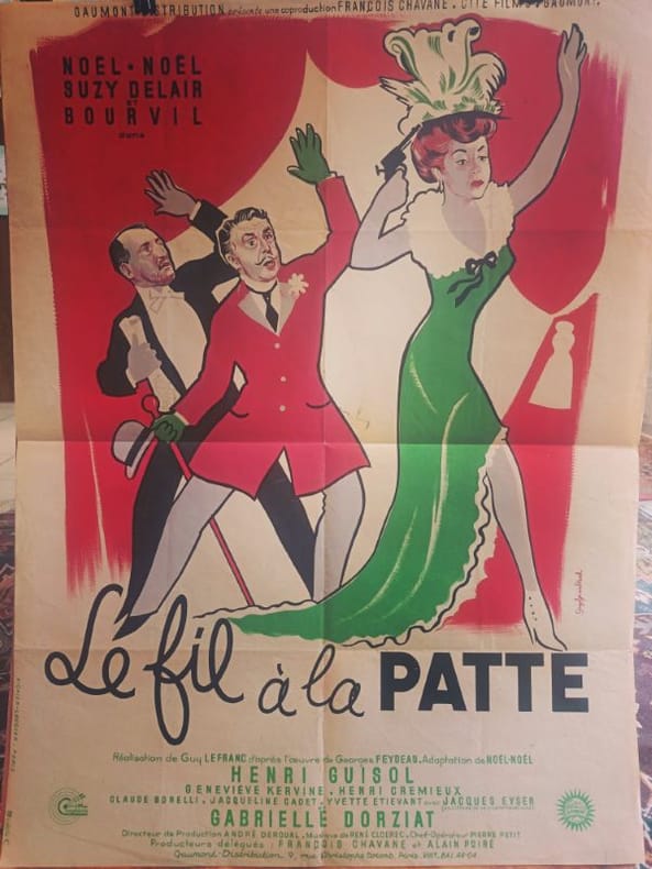 1954 60 x 80 LA MÉCANIQUE DU RIRE : Affiche originale (1954) du film Le Fil à la patte. Le génie de Feydeau prend vie sous la direction de Guy Lefranc dans cette comédie étincelante portée par Noël-Noël et l'irrésistible Bourvil. Une composition graphique joyeuse et rythmée qui capture toute l'effervescence des grands boulevards. Présentée dans un état exceptionnel, cette affiche est un hommage souverain à l'esprit français et à l'art du quiproquo magistral.