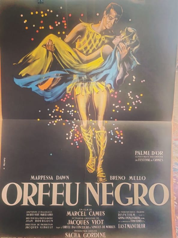 1959 60 x 80 L'EXTASE ET LE MYTHE : Sublime affiche originale (1959) du film Orfeu Negro. Le dessinateur Guy Allard signe ici l'une de ses œuvres les plus vibrantes, capturant toute la magie, la couleur et la tragédie de la Palme d'Or de Marcel Camus. Une composition incandescente qui célèbre la naissance de la Bossa Nova et la puissance éternelle du mythe d'Orphée. Présentée dans un état exceptionnel, cette affiche est une pièce souveraine, indispensable à toute collection d'art cinématographique d'exception.