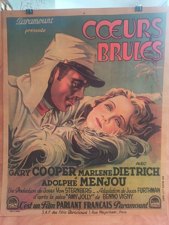 50 x 80 L'ÉCLAT DU MYTHE : Belle reproduction de l'affiche du film Cœurs brûlés (Morocco). Retrouvez l'intensité du duo Gary Cooper et Marlène Dietrich dans ce chef-d'œuvre de sensualité signé Sternberg. Une composition visuelle intemporelle, capturant l'élégance sauvage de la Légion et le magnétisme androgyne de l'icône Dietrich. Une pièce souveraine pour parfaire une décoration dédiée à l'Âge d'Or d'Hollywood.