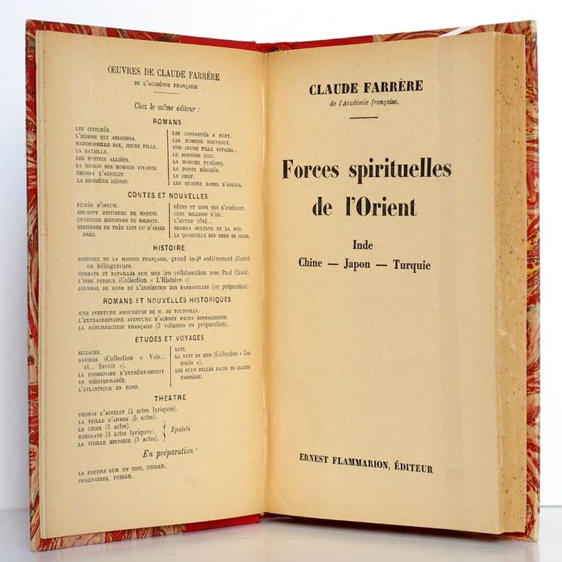 Flammarion 1937, in-12 relié demi-chagrin grenat à coins, dos à quatre nerfs et filets dorés, couvertures conservés, tranche supérieure dorée, 245 p. (une petite éraflure sur la reliure, sinon bel exemplaire bien relié) Un livre attachant, qui s'ouvre par un hommage bienvenu à Kipling, "notre maître à tous", l'introducteur et guide des Européens pour la connaissance de l'Inde.