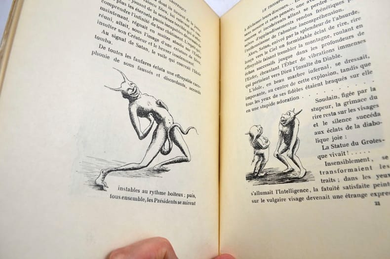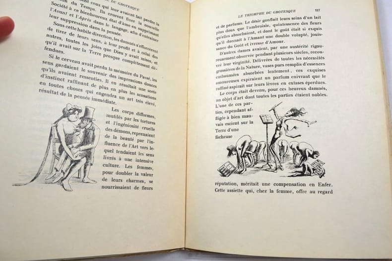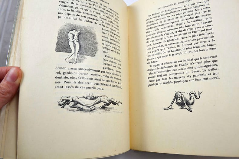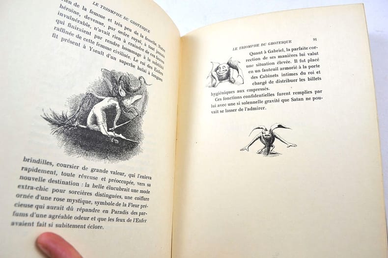 Fredh, Le triomphe du grotesque, Edouard Pelletan 1907, ouvrage relié ( reliure de bibliothèque demi basane tabac très légèrement frottée, plats toile écrue ), couverture conservée, illustré de cent treize compositions de l'Auteur. Complet de sa page " vient de paraître ", de sa présentation par l'Editeur et de ses 4 pages specimen. Edition originale tirée à 310 ex. ( celui-ci: n° 154 / 310 ) après 22 Japon. Très peu courant, bel exemplaire.