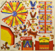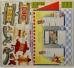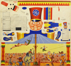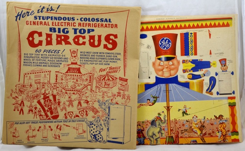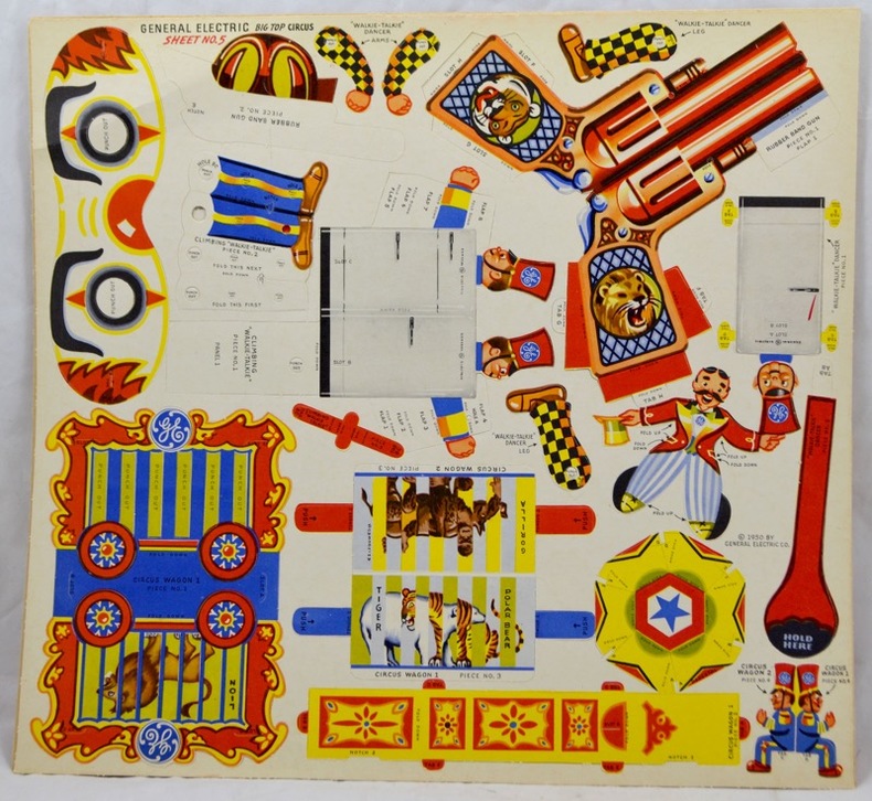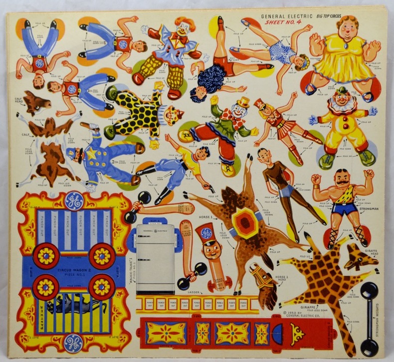 Ensemble de six planches en couleurs réunissant 60 pièces pré-découpées pour le montage d'un cirque complet avec chapiteau, manège, roue de la fortune, clowns, acrobates, freaks... Objet promotionnel pour les réfrigerateurs Général Électric.Déchirure à la pochette.