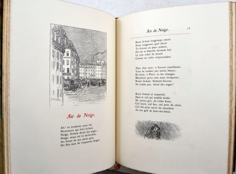 Paris Edouard Pelletan 1910 Ensemble 2 volumes in-4 reliés en un seul, demi-maroquin vert foncé à coins, plats de papier marbré, dos orné de filets dorés et de listels mosaïqués en maroquin havane et bordeaux; doublures et gardes de papier marbré, tête dorée, non rogné, couvertures imprimées.Très belle illustration de Steinlen comprenant 252 compositions in texte pour le premier livre, et 24 compositions in texte pour le second, dont le texte est en édition originale. Tirage limité à 325 exemplaires numérotés pour le premier livre, et 285 pour le second. Un des 267 (et 240) exemplaires sur vélin du Marais.