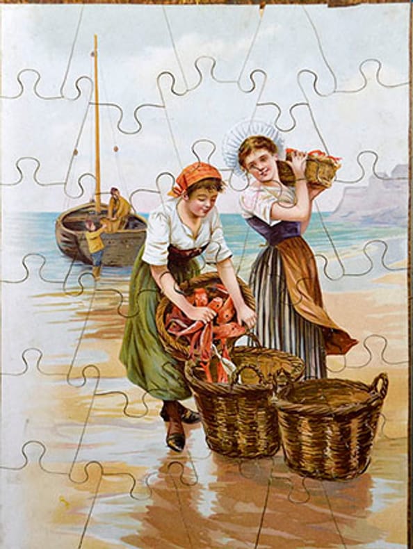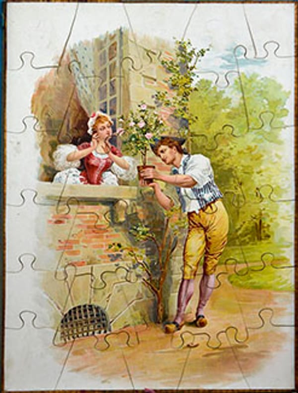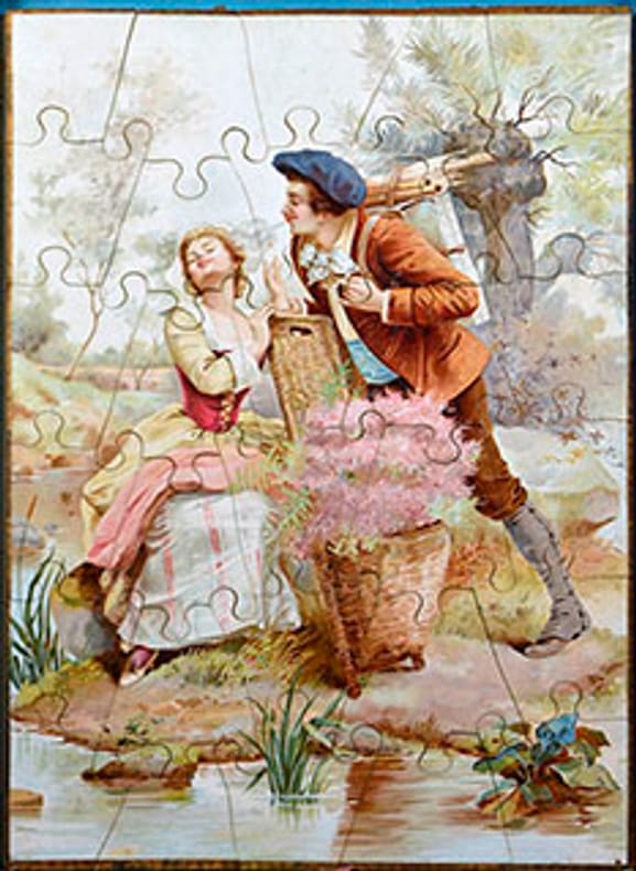 Trois puzzles en bois ornés de deux scènes galantes et d'une scène de pèche en lithographies. Bordures en papier gaufré doré.Après la dissolution de la société Baster et Vieillemard, une nouvelle société est formée entre Pierre Vieillemard et ses fils Thomas, dit Auguste et Emmanuel, dit Paul. Thomas Vieillemard restera à la tête de l'imprimerie jusqu'à sa mort en 1918. Entre-temps de nouveaux associés seront entrés dans le capital et l'imprimerie Vieillemard et ses fils deviendra Vieillemard fils et cie (1896), puis Imprimerie Vieillemard (1906).Ils sont spécialisés dans les objets publicitaires et commerciaux. Très bon état général. Petits manques à la frise de la boite, légers frottements aux angles.