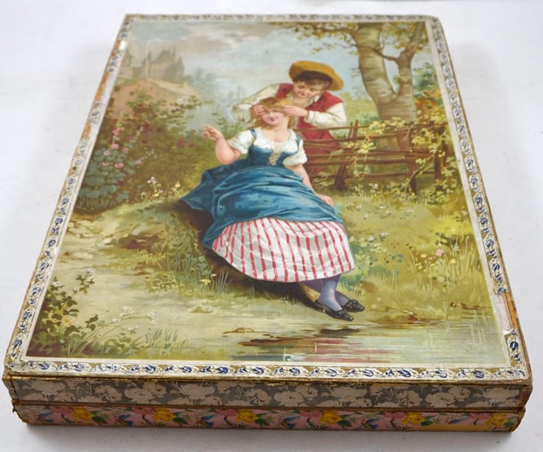Paris, Lith. Vieillemard fils et Cie, [Entre 1896 et 1906]. 37 x 26 cm. Boite ornée d'une lithographie en couleurs, frise florale encadrant les contours de la boite.