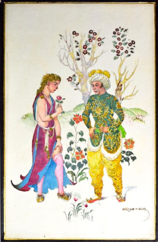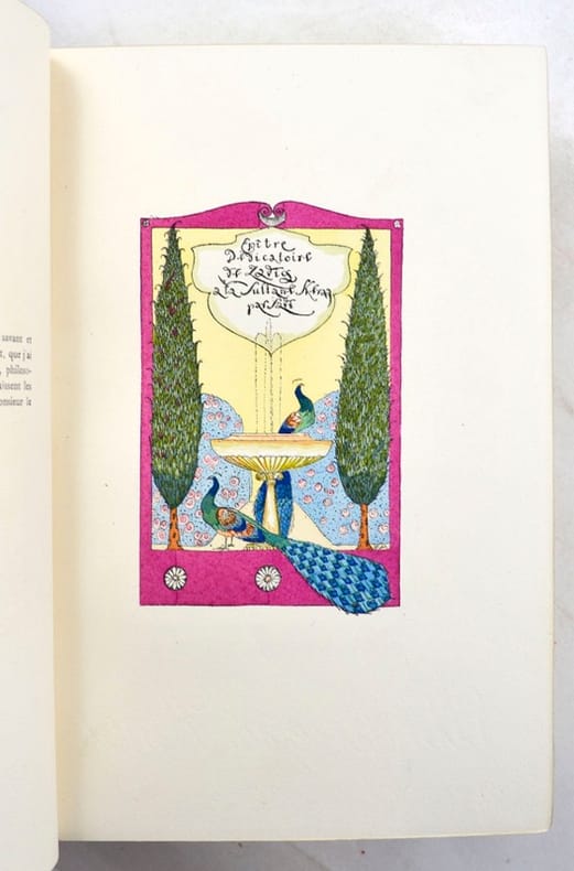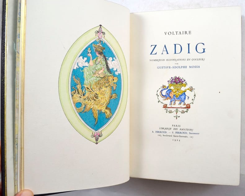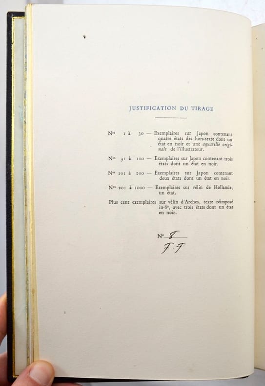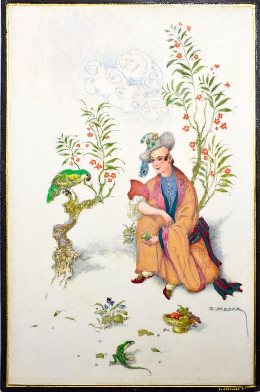 Illustrations en couleurs de Gustave-Adolphe Mossa.Tirage à mille cent exemplaires, celui-ci un des cent exemplaires sur vélin d'Arches, texte réimposé in-8, avec trois états dont un état en noir.Exemplaire enrichi de deux belles aquarelles originales inédites, peintes sur parchemin et collées sur les contreplats. Elles sont signées par l'artiste.Traces blanches à la reliure.
