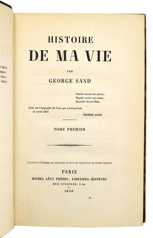 Paris, 1855. Leipzig, chez Wolfgang Gerhard [Typographie de L. Schnauss] 13 tomes reliés en 6 volumes petits in-12 (14 x 10 cm) de 162, 166, 147, 171-(1), 164, 160, 160, 160, 164, 160, 160, 160 et 154-(6) pages. Collationné complet. Reliure demi-basane maroquinée bleue nuit, dos lisses ornés de filets dorés en guise de faux-nerfs, auteur, titre et tomaisons dorés, plats de papier marbré. Reliures homogènes, décoratives et solides. Quelques légers frottements, intérieurs frais en dépit de rousseurs et brunissures du papier localisées essentiellement aux premiers et derniers feuillets. Bon papier pour l'ensemble de la série. Très rare édition non autorisée ou préfaçon publiée à Leipzig très peu de temps après le lancement de l'édition française en volumes à Paris par Lecou (1854-1855, 20 volumes in-8). La plupart des bibliophiles peuvent abandonner l'idée de trouver à bon compte et en belle condition d'époque la très rare édition originale publiée entre 1854 et 1855 en 20 volumes in-8 à Paris chez Lecou. L'édition primitive et la seule que l'on rencontre assez souvent, elle celle donnée l'année suivante (1856) en 10 volumes in-18 par Michel Lévy frères. Le texte d'Histoire de ma vie avait été publié en feuilleton dans La Presse entre le 5 octobre 1854 et le 17 août 1855 (138 numéros). L'édition dont nous donnons ici le descriptif est une édition non autorisée (clandestine ou contrefaçon pourrait convenir) dont l'histoire et le détail mérite d'être donné, tant pour sa rareté avérée que pour ses particularités bibliographiques. Voici quelques éléments qui permettent de situer dans le temps ce tirage spécial de Leipzig. On trouve dans notre exemplaire, et ce uniquement à partir du quatrième tome, un timbre encré circulaire portant mention "SAECHS. FRANZOES. VERTRAG. 1856" qui signifie : traité conclu entre la Saxe et la France. Ce cachet signifie que les volumes sur lesquels il est apposé ont été soumis aux stipulations du traité conclu en 1856 entre la Saxe et la France sur la propriété littéraire. Ce traité a été promulgué le 14 juin 1856. En résumé il s'agit d'un traité qui protège l'un et l'autre pays, France et Saxe, contre les contrefaçons (éditions non autorisées) et ce de manière bilatérale. A cette époque, Leipzig, comme d'autres villes d'Europe (Bruxelles notamment), est un véritable centre de la contrefaçon en matière d'édition des auteurs, français notamment. Plutôt que de détruire les éditions lancées sur la marché avant le printemps 1856, il a été décidé de faire un inventaire complet des fonds des libraires de Leipzig et des autres villes de Saxe afin de recenser ces éditions non autorisées. Plutôt que de les détruire (au détriment des libraires et imprimeurs locaux) il a été décidé de faire apposer systématiquement ce cachet encré, stigmatisant ainsi de manière claire et nette tout volume publié sans l'accord de l'auteur. Les exemplaires non revêtus de ce timbre encré étaient passibles de confiscation et de destruction tant chez les imprimeurs et libraires-éditeurs. De ceci découlait une taxation à l'importation sur le sol français (20 francs pour 100 kg pour les livres et brochures). Tout finit toujours par s'acheter ... y compris les droits d'auteurs ... au kilo ! De ce fait, les exemplaires de cette édition (dont nous ne savons pas le chiffre du tirage) ont dû être assez peu répandus sur le sol français. Sans doute même de très nombreux exemplaires, non revêtus du timbre encré, ont-ils été détruits par l'administration française. Tous ces éléments font que cette série, complète en 13 tomes, est devenue fort rare. Il fait maintenant nous arrêter au contenu de ces 13 tomes. Nous avons comparé minutieusement le détail des chapitres entre l'édition définitive de 1876 (la dernière revue par l'auteur), l'édition originale de 1855 en 20 volumes in-8 (Lecou) et notre édition de 1855 (Leipzig). Il s'avère que plusieurs différences notables sont à signaler. Le découpage des parties est différent (pour s'adapter matériellement au format de l'édition de Leipzig, en 13 volumes contre 20 volumes pour l'originale). Par ailleurs, on constate dans l'édition de Leipzig (1855) la suppression du chapitre VI (première partie), chapitre consacré au Maréchal de Saxe (ce n'est sans doute pas un hasard si ce chapitre a été supprimé de cette édition ... de Saxe). Il faut remarquer ensuite, chapitres après chapitres, de nombreuses suppressions de paragraphes (notamment et plus particulièrement aux chapitres VII, VIII, IX, X, XI, XII, et plusieurs autres. Ces suppressions sont-elles dues à une auto-censure de l'éditeur de Leipzig ou bien un allègement du texte (pour gagner du volume ...) concernant des chapitres jugés "non essentiels". L'affaire serait à creuser et mérite toute l'attention des bibliographes à naître. Quoi qu'il en soit, il en résulte que cette édition de Leipzig présente donc un texte allégé de plusieurs chapitres et paragraphes. Difficile d'imaginer que George Sand n'ait pas eu vent de cette édition "pirate" venue de Saxe. Qu'en a-t-elle pensé ? écrit ? dit ? Peut-être sa correspondance en fait-elle mention ? Nous n'avons rien trouvé à ce sujet. Nous avons trouvé trace d'une édition de Berlin (F. Schneider, [ca 1855], 20 tomes - CCfr, B.M. Rennes, cote HP 4604/1-20), et une autre aussi à Leipzig (chez Auguste Schnee) en 11 vol. in-16 donnée comme la pré-façon (pré-originale de l'édition Lecou). Ces trois éditions de Leipzig et Berlin, trois préfaçons, montrent assez l'engouement pour ce texte dès sa publication dans La Presse. Histoire de ma vie n'est pas une biographie linéaire. C'est un choix de morceaux de la vie de George Sand. Les premiers volumes sont tout entiers consacrés à l’ascendance de bonne dame de Nohant. Sa famille, ses relations, ses émotions, sa jeunesse. Il faut d'ailleurs 