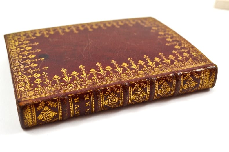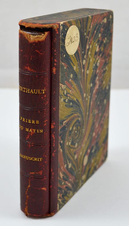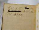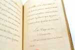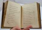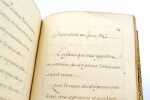 Manuscrit soigneusement écrit dans une belle calligraphie. Encadrement du texte au crayon. L'écriture a été attribuée à Berthault. Son nom est doré au dos de la chemise et annoté au crayon au dos du feuillet de garde.Deux petite gravures XVIIe rehaussées en couleurs ont également été contrecollées au dos des gardes.Signature manuscrite au dernier feuillet : Rosaly de (nom barré) de (nom barré) Blondelle de Rieux.De la bibliothèque de Mortimer. L. Schiff, avec son ex-libris contrecollé. Ce manuscrit est référencé dans le catalogue de sa bibliothèque, au numéro 2123.> Catalogue of a selected portion of the famous library […] formed by the late Mortimer L. Schiff. 1938.Rousseurs aux feuillets liminaires blancs. Petite griffure au second plat. Manque à la coiffe supérieure de la chemise et déchirure au caisson inférieur.