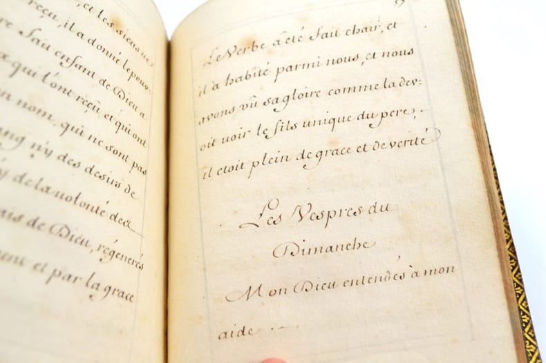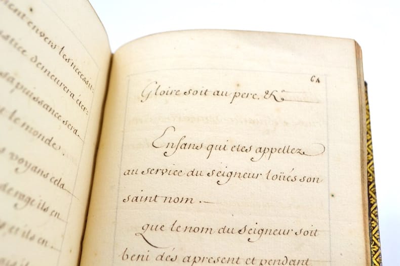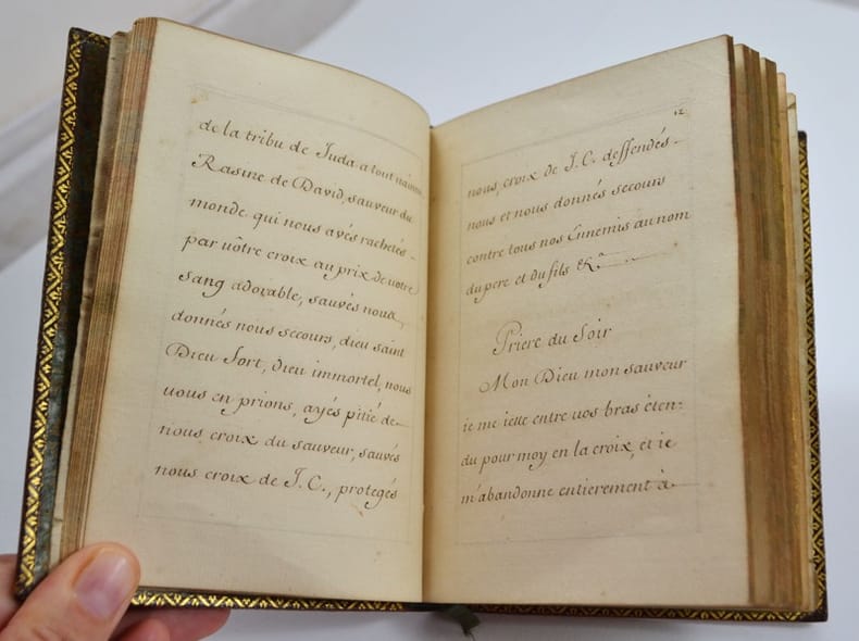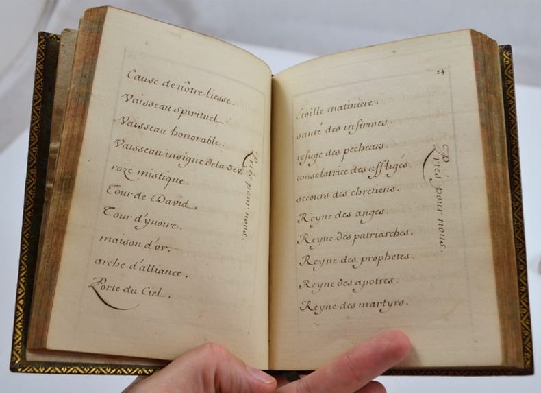[Vers 1690]. 1 vol. in-12. 13,9 x 10,3 cm. 72ff. Plein maroquin rouge d'époque, encadrement à la dentelle sur les plats avec motifs floraux et fleurs-de-lys, dos à nerfs orné, titre doré "Heur Chre" au dos, contreplats et gardes de papier gaufré vert et or, tranches dorées, chemise de demi-maroquin à rabats et étui.