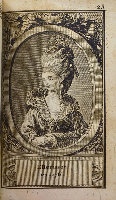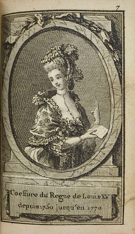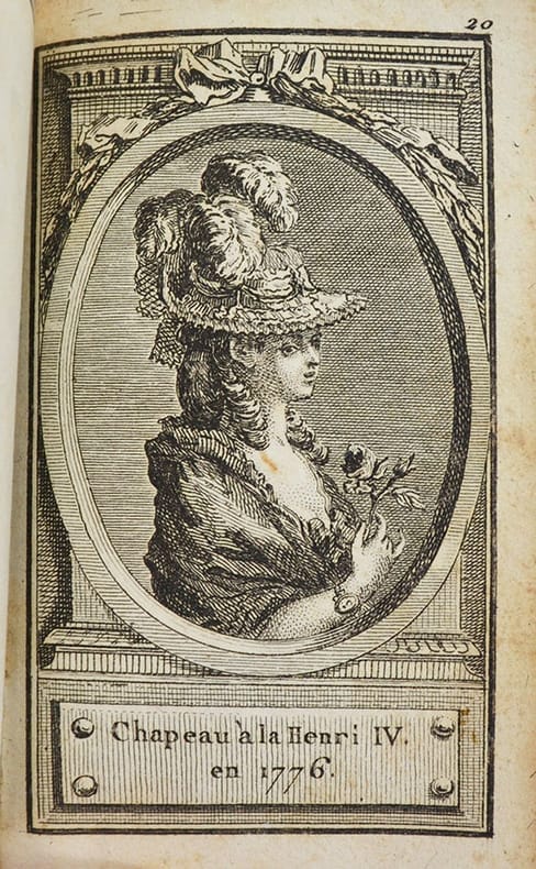 En second titre : Almanach de la toilette et de la coeffure des dames françoises, suivie d'une dissertation sur celles des dames romaines. Souvenir à l'angloise.Notre exemplaire semble être un almanach composite dont Desnos avait la spécificité. Il contient le frontispice des 4 femmes en costume de différentes époques, un long article historique sur la toilette et la coiffure et 24 planches de coiffure légendées et numérotées de 1 à 24 : 1 à 4 (avec 4 planches bis) - pas de planches 9 à 12. « Ces figures, gravées avec soin, sont toutes dans un médaillon ovale à cadre orné reposant sur un fond au burin Les légendes sont placées au-dessous, sur une tablette-console ». « Très rare ». Elles sont décrites au n°572 du Grand-Carteret, qui porte le second titre de notre exemplaire, à la date de 1777.Elles font ici face à un feuillet vierge, orné simplement d'un encadrement gravé. Ces feuillets contenaient des vers décrits au n°639 de Grand-Carteret - ici, dits avant la lettre.Nombreux feuillets blancs, puis 6 feuillets de calendrier 1781.« Ce recueil est, en somme, un almanach non plié : chaque feuille étant tirée pour être pliée en quatre et former un almanach ».Cohen indique « Ces petites planches ont reparu, par séries de 12, dans un certain nombre d’almanachs édités par Desnos ». Cohen.Colas, 2514. Cohen, 863. Grand-Carteret, 572 & 639.Petite tache au centre des feuillets de texte.