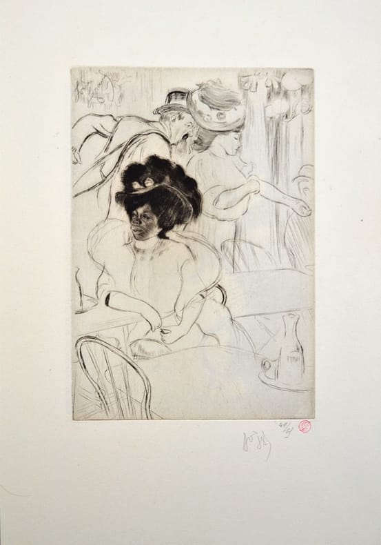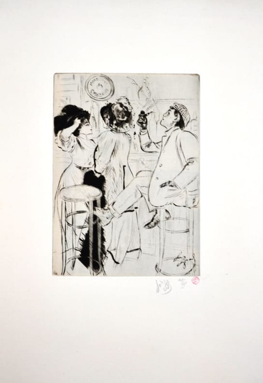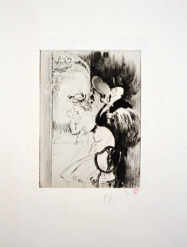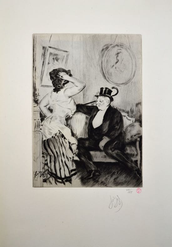 Rare suite de huit pointes sèches à toutes marges : . Elles sont numérotées 48/65, signées et titrées au crayon, portent le cachet rouge de l'éditeur, avec la signature de l'artiste dans la gravure. Filigrane de l'éditeur et l'artiste sur le papier.Tirage à 95 exemplaires avec les épreuves sans remarque et 30 exemplaires comportant les épreuves avec remarques, ici un des 65 épreuves sans remarque. Il est également numéroté au crayon sur la chemise.Elève de l'école des Beaux-Arts de Dijon, Louis Legrand vint à Paris étudier la gravure à l'eau-forte chez Félicien Rops. "Quel homme, ce Legrand, il trouverait des angles dans une boule de billard". (Félicien Rops). Gustave Pellet (1859-1919), d'abord Quai Voltaire, puis rue le Peletier 51, était éditeur de livres et d'estampes depuis 1887. Propriétaire des droits artistiques de Félicien Rops, il a édité, d'après les plus belles aquarelles, ou dessins et peintures de cet artiste, une centaine de planches en noir et en couleurs, la plupart gravées par Albert Bertrand. Mais Pellet est surtout l'éditeur attitré, et le seul, des œuvres de Louis Legrand, dont il a, le premier, compris le talent. Outre ses gravures et lithographies, il a publié trois volumes illustrés par cet artiste, à savoir le Livre d'Heures, La Faune Parisienne, et Poèmes à l'Eau-forte. Ce dernier ouvrage, le plus important de tout l'œuvre de Legrand, a paru en juillet 1914. Enfin Pellet est le premier éditeur des lithographies en couleurs de Toulouse-Lautrec ; il a édité vingt œuvres, les plus célèbres de cet artiste, les premières datant de 1892. Vers cette époque il a également édité les premières lithographies en couleurs de Georges Redon, de Signac, de Luce, d'Anquetin, etc. Mort à Paris.Bel état général. Petite trace au bas du premier plat de la chemise, deux lacets en partie coupés conservés à l'intérieur de la chemise.