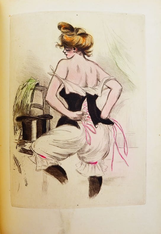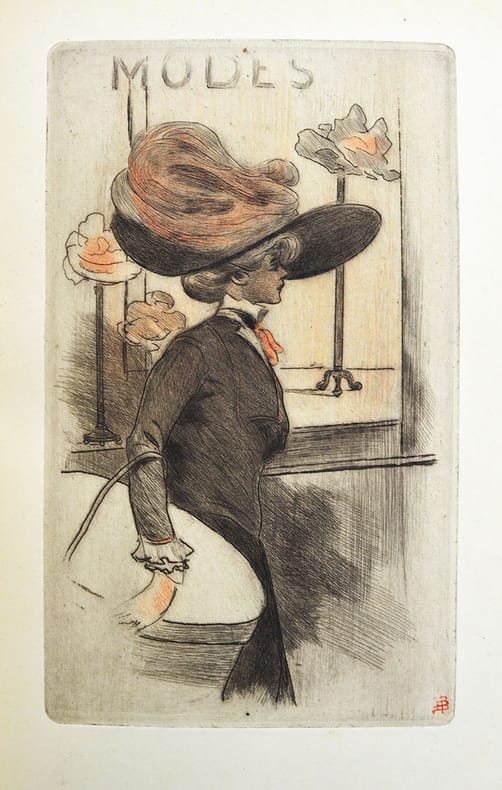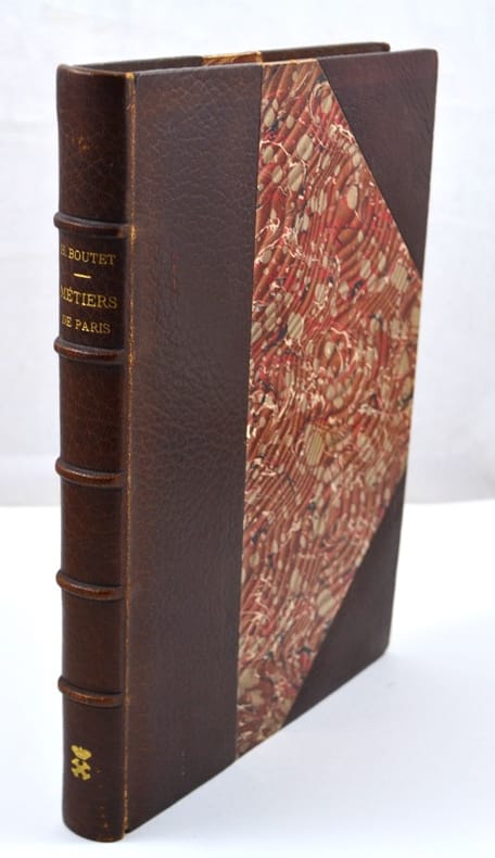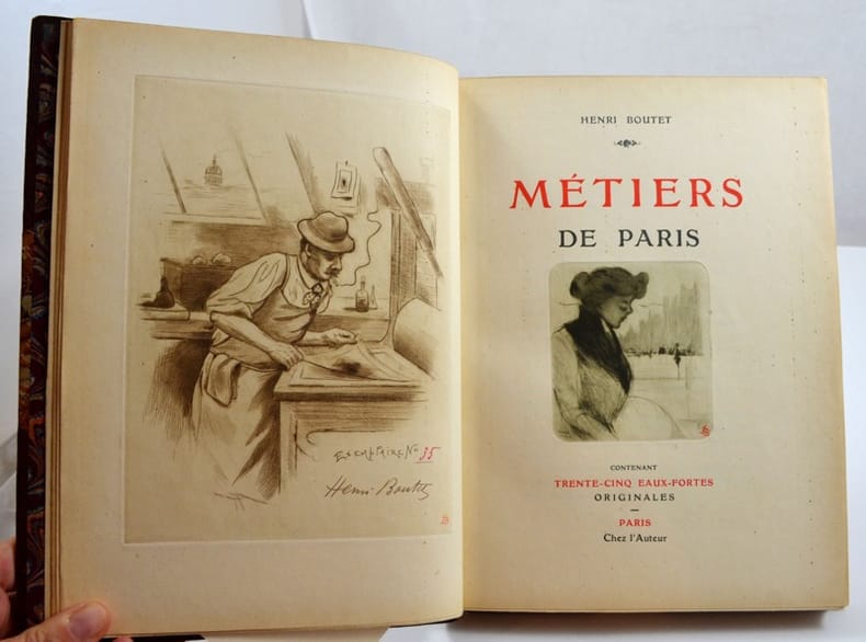 Ouvrage sur les petits métiers de Paris illustré de 35 eaux-fortes originales dont la couverture, illustrée en couleurs, un frontispice représentant l'artiste au travail, une cigarette à la bouche, Montmartre en arrière-plan, une vignette de titre, et 32 hors-texte dont huit en couleurs. Douze concernent les métiers féminins.Tirage limité à cent exemplaires, chaque exemplaire numéroté, signé et portant le monogramme de l'artiste, au frontispice.Henri Boutet est fils d'un joaillier. Auteur de lithographies et pastelliste français, on lui doit des estampes sur les paysannes normandes, des pointes sèches sur les femmes parisiennes... "Il a croqué plus de Parisiennes que Croquemitaine de petits enfants... il les croque toutes crues le monstre ! En robe, en pantalon, en chemise, quelquefois moins icelle... Eleusis avait ses mystères ; les corsets n'en n'ont plus pour Henri Boutet" (Hippolyte Devillers).Exemplaire d'Emeline de Broglie (1911–1986), avec son ex-libris armorié collé au contreplat, répété en queue de dos. Légers frottements aux mors, petite bande de décoloration longeant le mors supérieur.