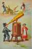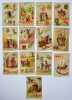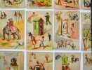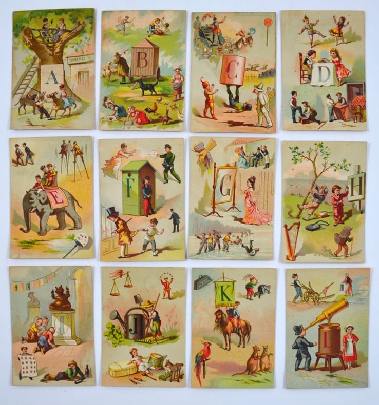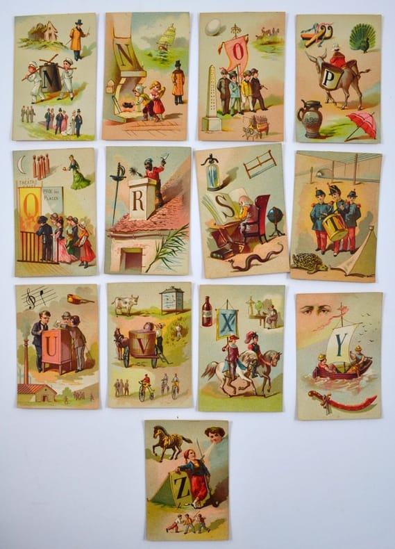 Ensemble de 25 cartes lithographiées, chacune illustrant une lettre de l'alphabet : souvent une scène centrale entourée de petites saynètes alentour, chacune commençant par la lettre. Ainsi, l'Éléphant côtoie l'échassier, l'éventail et l'écolier, le Jardinier se mêle à la justice, au jongleur et aux jouets. Sans la lettre W.Belle fraîcheur des coloris pour ce charmant ensemble.Sans mention d'éditeur ou de lithographe, on peut supposer qu'elles aient été distribuées à des fins publicitaires.Traces de colle au dos.