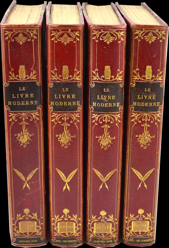 Paris Quantin 1890 Grand In8 - Demi maroquins à coins , dos richements ornés ( chouettes , plumes dates et fleurons dorés ( Reliures signées de Petrus Ruban ).Papier bien blanc sauf environ 25 pages qui ont des rousseurs dans le 2e volume .431 , 399 , 384 et 384 pages . Ensemble des 24 numéros de cette prestigieuse revue dédiée à la Bibliophilie dont Octave Uzanne est le rédacteur en chef. Premier volume (janvier-juin 1890). Deuxième volume (juillet-décembre 1890). Troisième volume (janvier-juin 1891). Quatrième volume (juillet-décembre 1891).Tirage à 1050 exemplaires, celui-ci numéroté 551 sur Vergé des Vosges . Ouvrage orné de 44 planches hors-texte . In-textes, ornements et lettrines illustrées. Toutes les couvertures de livraison illustrées sur papiers de différentes couleurs ont été reliées à la fin de chaque volume, en très bon état. Les couvertures des livraisons ont été dessinées par Adolphe Giraldon et gravée par Clément Bellenger.Bien complet de tous les hors texte ( E. Fornet, F. Rops, A. Robida, Bracquemond, Morin, F. Courboin, Eugène Giraud, E. Abot, H. Manesse, E. van Muyden, A. Robida, L. Métivet , Chérate et Willette entre autres ) . Sans la Table rédigée par Michel Mourlevat, publiée en 1892. Avec une table des matières rangées par ordre alphabétique en fin de chaque volume. Cette revue fait suite à la revue mensuelle Le livre, parue entre 1880 et 1889.Exemplaires magnifiques d'une revue bibliophilique dont Octave Uzanne fut le chef d'orchestre . La somptueuse reliure dite " à la chouette et aux attributs littéraires " fut parfaitement établie par Pétrus Ruban ( 1851-1929) . Celui-ci fût l'un des relieurs les plus en vogue au tournant du siècle et les plus grands bibliophiles lui confièrent leurs ouvrages qui sont toujours trés recherchés .