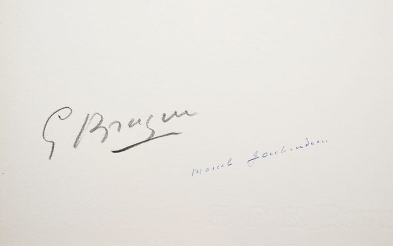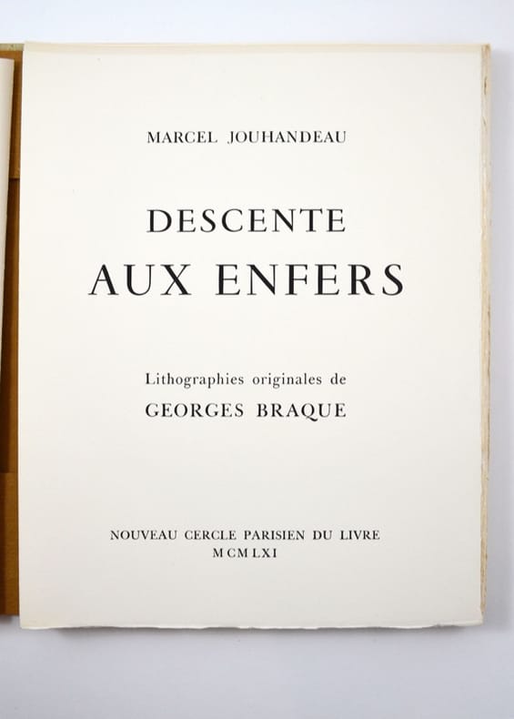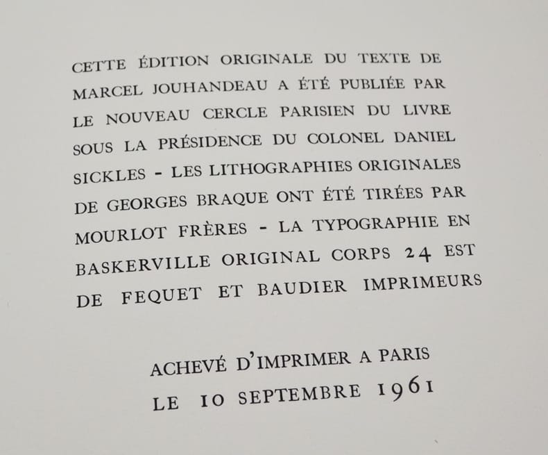 Ouvrage orné de quatre lithographies originales de Georges Braque tirées par Mourlot Frères. Tirage sur papier de Rives à 200 exemplaires, un des 170 exemplaires numérotés et un des 150 premiers justifiés au nom des membres. Avec la signature de Georges Braque et Marcel Jouhandeau.