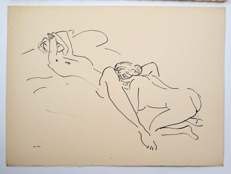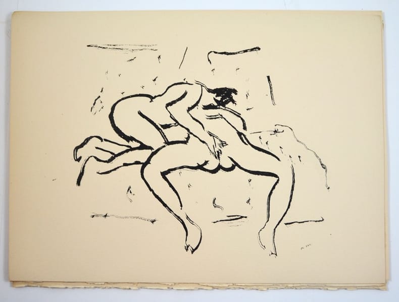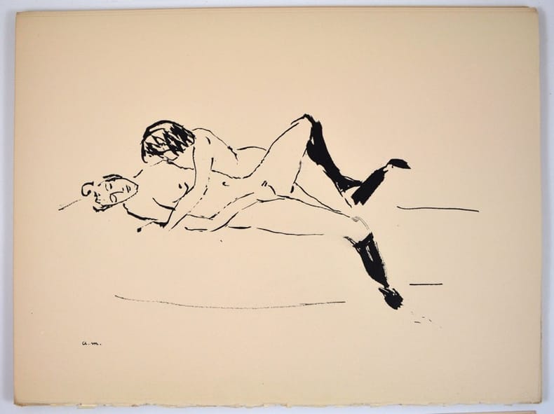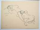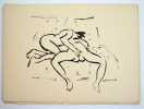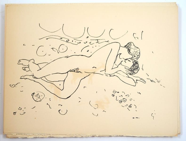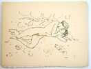 Rare suite illustrée de 28 planches érotiques, réalisées à l’encre de chine, au pinceau, à la plume, au bambou, mettant à l’honneur Marquet dessinateur.Ces croquis furent réalisés, les uns, " à Paris, dans son atelier, en 1912, l’année où il peignit Les Deux Amies , les autres en 1916, à Marseille, sur les quais du Vieux Port qui l’enchantaient, plus précisément quai de Rive-Neuve dans l’atelier du copain Monfort ".Tirage à cent exemplaires numérotés sur vélin d'Arches et réservés aux seuls membres de la compagnie, ainsi que vingt exemplaires d’auteur, celui-ci n° 66." Le peintre, très grand, aura trop longtemps voilé le dessinateur prodigieux des temps modernes que fut Albert Marquet ". Fente aux mors de la chemise. Dutel, 1932. Monod n° 7787.