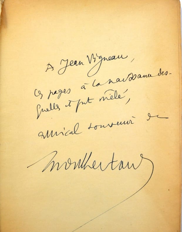 Édition originale, un des 24 exemplaires de tête sur japon, un des six numérotés en chiffres romains. Exemplaire enrichi d'un bel envoi autographe de l'auteur "à Jean Vigneau, des pages à la naissance desquelles il fut mêlé, amical souvenir de Montherlant". Après avoir été l'un des administrateurs des éditions Bernard Grasset, Jean Vigneau crée sa propre maison d'édition à Marseille en 1941. Les Nouvelles chevaleries de Montherlant est le premier ouvrage qu'il édite en 1942. En 1966, il devient le Directeur-général adjoint de la Revue des deux Mondes poste qu'il occupe jusqu'en 1971.