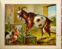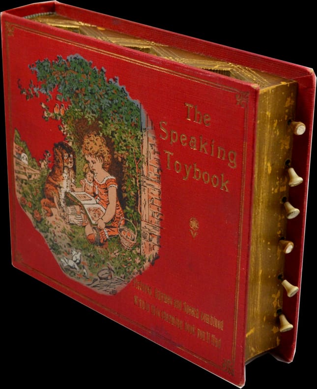 Les soufflets miniatures à l'intérieur du livre fonctionnent lorsque le petit gland indiqué sur chaque page est tiré. "Pictures, Rhymes and speech combined" - L'histoire est complétée d'une chromolithographie et d'un son pour chacun des six animaux. Une petite flèvhe graphique indique la tirette à utiliser.Sonneberg devint dans la seconde moitié du XIXe siècle la « capitale mondiale de l'industrie du jouet ». On y produisait de nombreux appareils à voix pour les poupées et les jouets en peluche. En 1878, l'éditeur sonnebergais Theodor Brand obtint un brevet pour la création d'un livre intégrant des images et des sons. Ce « livre d'images parlant » connut un immense succès, qui perdura pendant plusieurs décennies. Cet ouvrage en anglais de petite taille était destiné à l'exportation vers les pays anglophones et fabriqué après 1910.Les exemplaires en état de fonctionnement sont très rares. Notre exemplaire est de toute fraîcheur. Petite fente au mors supérieur mais non aux extrémités, petite tache en bas du premier plat.