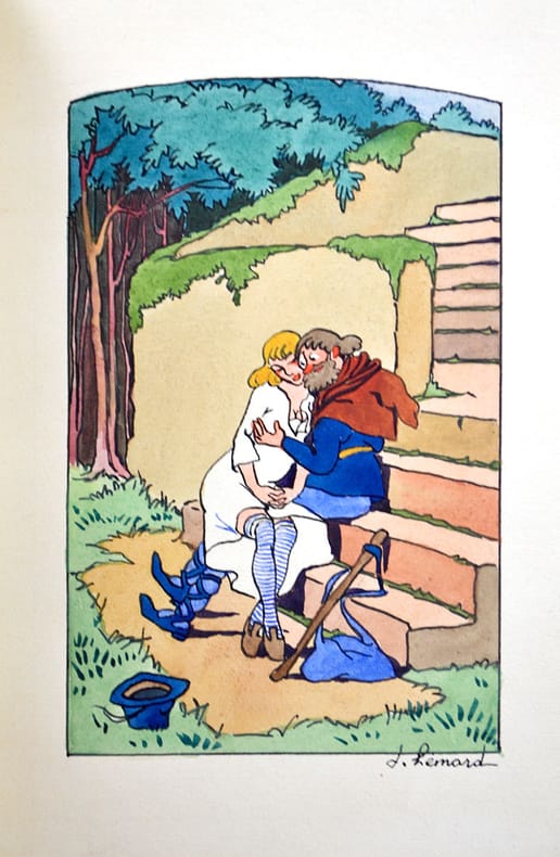 Paris, Georges Crès & Cie, 1914. 1 vol. in-8. 51pp, [1]f. Plein maroquin brun éditeur, décor mosaiqué représentant le vieux contant fleurette à une jeune paysanne, large encadrement floral en noir, fer à l’oiseau en noir au centre du second plat, titre et auteur dorés dans la longueur du dos, deux nerfs saillants aux extrémités du dos, tête dorée, maroquin brun encadrant les contreplats avec deux filets noirs et fleurons d’angles, couvertures et dos conservés, sous étui [KIEFFER].