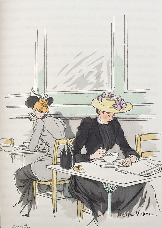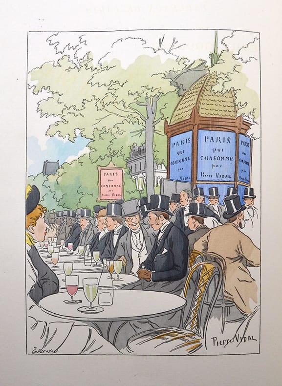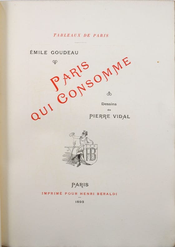 Ouvrage illustré de 51 compositions en couleurs de Pierre Vidal, dont le frontispice et 50 à pleine page.Tirage unique à 138 exemplaires sur papier vélin des Vosges.Édition originale. Il s'agit d'un tableau de la gastronomie parisienne commandé par Beraldi à Pierre Vidal et Émile Goudeau.Traces de décoloration à la couverture ainsi qu'une petite tache au second plat. Bon état intérieur.