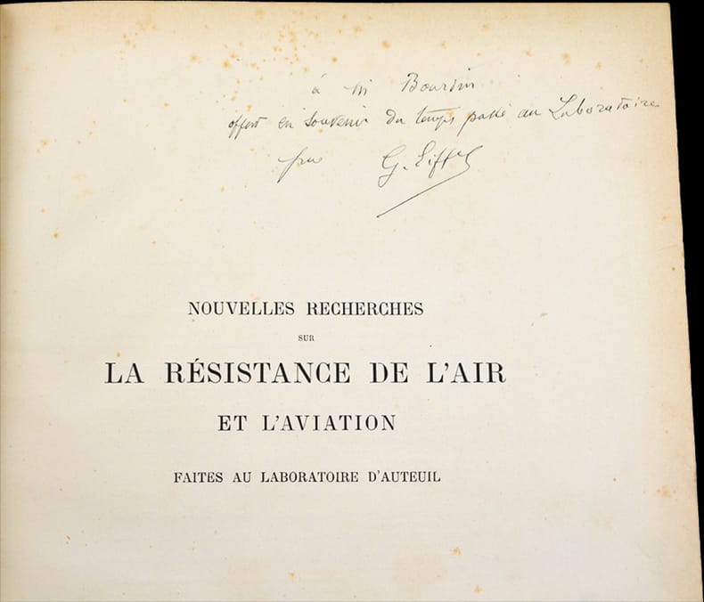 Édition originale.Héliogravure représentant une Chambre d'expériences du laboratoire Aérodynamique de M. Gustave Eiffel à Auteuil en frontispice. Nombreuses illustrations et graphiques in-texte certaines à pleine page. Avec un calque imprimé volant correspondant à la page 61.L'atlas comprends 39 planches la plupart à double page ou dépliantes.Exemplaire enrichi d'un envoi autographe d'Eiffel à "Mr Bourdin offert en souvenir du temps passé au Laboratoire"Planche XXXIX en double. On joint une héliogravure représentant une Chambre d'expériences du laboratoire Aérodynamique de M. Gustave Eiffel. (Dujardin - Cliché H/ Manuel). Avec quelques rousseurs en marge.Moins célèbres auprès du grand public que sa tour, les recherches en aérodynamique et en météorologie de Gustave Eiffel ont eu une influence considérable sur le développement de ces sciences. Sa soufflerie de la rue Boileau à Auteuil, achevée à ses frais en 1912 en remplacement de la première soufflerie qu’il avait déjà fait construire en 1909 sur le Champ de Mars aux pieds de la Tour, va fixer les règles de l’Aérodynamique et rendre d’immenses services par ses essais aérodynamiques dans de nombreux domaines : Aéronautique, Automobile, Bâtiment, Bateaux, Centrales thermiques, Pont, Radars, etc…La soufflerie est toujours en activité aujourd'hui, exploitée par la société Aérodynamique Eiffel.Ce laboratoire d'aérodynamie servit notamment à tester les caractéristiques des biplans militaires Farman qui furent utilisés durant la première guerre mondiale.Bel exemplaire.