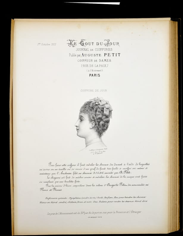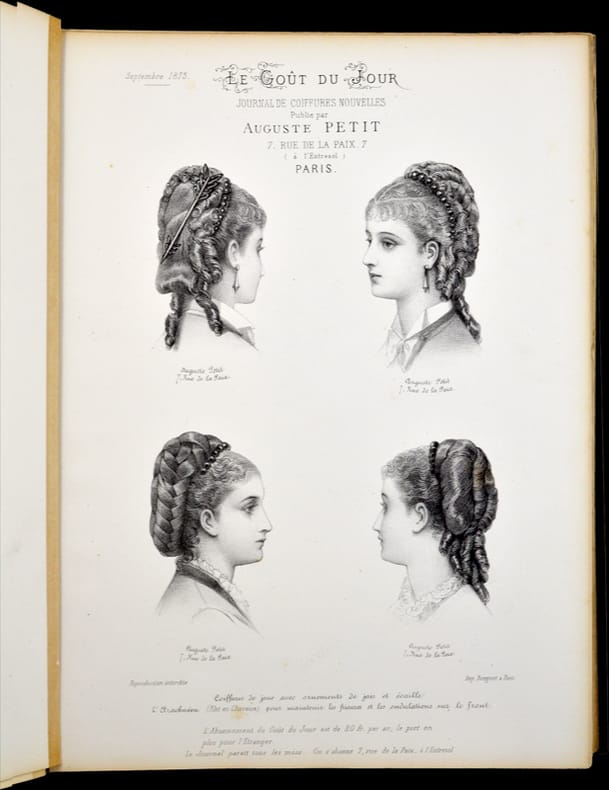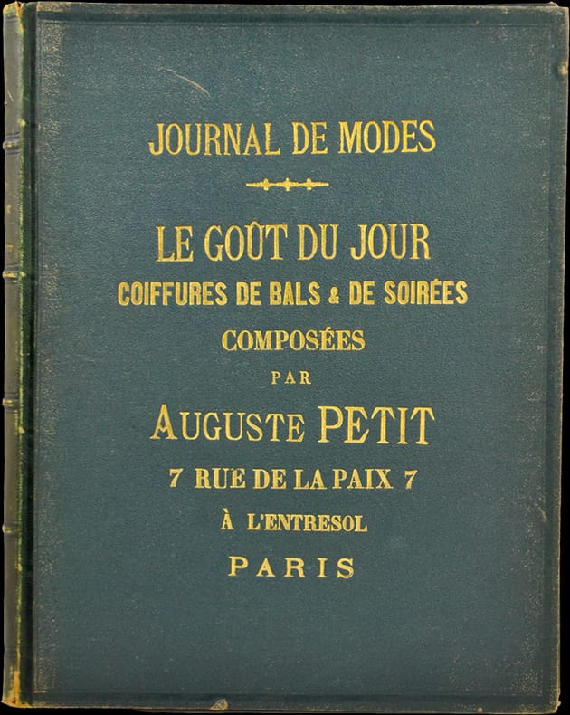 Réunion d'un ensemble de 57 planches lithographiées éditées entre 1875 et 1880 pour le journal publicitaire mensuel Le Goût du Jour coiffures Nouvelles composées par Auguste Petit.Une planche par mois. Manquent quatre planches sur les 5 années : Novembre 1875, Février et Mai 76 et Novembre 1877. Deux planches pour Janvier 1880 dont une sur chine collée. La planche Juillet 1875 est en couleurs.L'année 1878 est montée rétrospectivement de décembre à janvier. Chaque planche porte des indications concernant la coiffure présentée.Album composé par Auguste Petit 7 rue de la Paix, 7, à l'entresol - Paris, coiffeur de dames.Avec un envoi autographe à son confrère Ulysse Boucoiran éditeur de la Coiffure française illustrée daté de 1921. Avec l'ex-libris d'Auguste Gilles Petit dessiné par A. Monnier en 1898. Avec une note manuscrite ajoutée : "Auguste monté sur l'échelle de Jacob, des derniers échelons atteignant la planète, sans vertige et sans peur, aussi fringant que snob, avec le fer "Vucain", ondule la comète! Pierrefitte 1921, Georges Dupuy".Joint, monté sur onglet, en début d'ouvrage, un fascicule imprimé sur papier vert, listant les produits de la parfumerie spéciale pour dames proposée par la maison Petit. Certaines planches déreliées. Quelques rousseurs.
