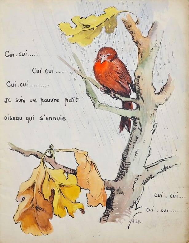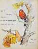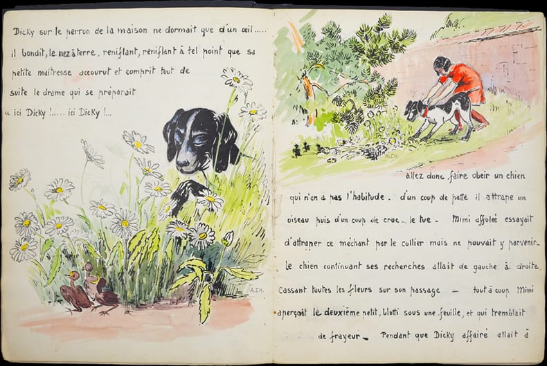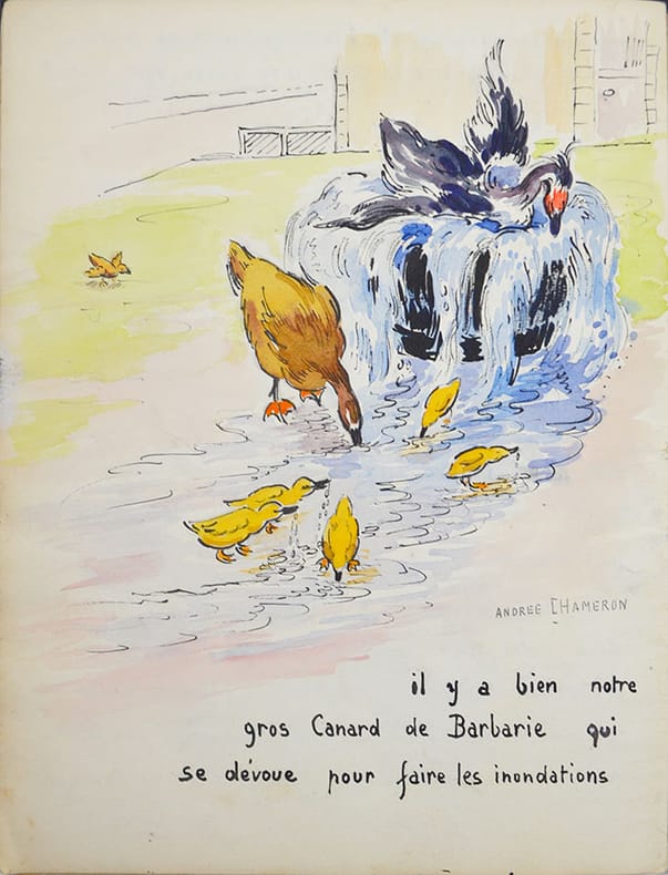 Charmant enfantina manuscrit, illustré à l'encre, à l'aquarelle et à la gouache par la peintre Andrée Chameron (1894-1985). Il réunit "trois contes de mon jardin" (une page de titre) : Oui, Rouge-gorge je suis! (14pp), Ils étaient six petits canards - six jolis petits canards (15pp), Je t'en supplie! reste petit pigeon! (10pp). Projet manuscrit orné de 34 dessins originaux signés ou monogrammés. Ces trois contes mettent en scène fauvettes, canards, rouge-gorge et pigeons dans un éloge à la nature parfois cruelle, souvent simple et réconfortante. Joint : 2 doubles feuilles volantes (22 x 28 cm) portant un conte inachevé, illustré de dessins à l'encre et l'aquarelle et 1 feuille de dessin (30x23 cm) avec une composition à pleine page, encre et aquarelle. Andrée Chameron (1894-1985) "peintre de fleurs et de paysages", née à Saint-Maur a exposé au Salon des Indépendants de 1920 à 1943, au salon d'Automne, de 1924 à 1930. Invitée aux Tuileries de 1930 à 1935. Benezit, II, 651.