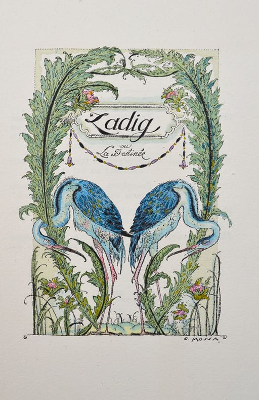 Nombreuses illustrations en couleurs de Gustave-Adolphe Mossa dont la couverture illustrée, un titre-frontispice, un frontispice, un fleuron pour le titre avec remarques, un titre pour l’épitre, 22 hors-textes, 22 en-têtes, 22 culs-de-lampe et 22 lettrines.Tirage à mille cent exemplaires, celui-ci un des cent exemplaires sur vélin d'Arches, texte réimposé in-8, avec trois états dont un état en noir.Petite fragilité à la charnière supérieure. Bon exemplaire.