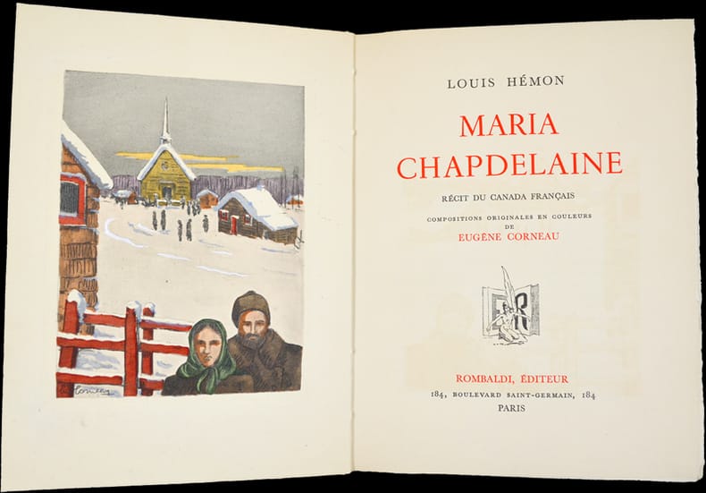in-8 illustré couleurs, 203p. Couverture imprimée. :: Tirage numéroté sur vergé de Voiron (no 2120). :: Publié à l'occasion du voyage à Péribonka de la Société des amis de Maria Chapdelaine pour le 25e anniversaire de la parution. Catalogue Maria Chapdelaine, BNQ, 1980, no 99. :: Reliure de l'époque, demi-chagrin bleu, 4 nerfs sautés, pièce de titre rouge, tête dorée,couvertures et dos conservés. Coins frottés, nerfs éraflés.