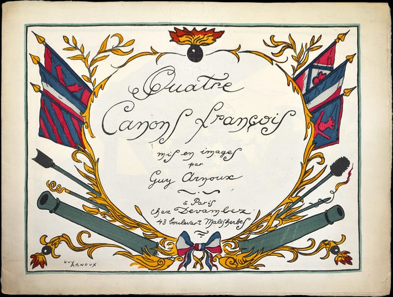 4 planches patriotique illustrées au pochoir, signées et numérotées sur papier vergé : "L'Ancêtre", "La Bombarde", "Le Gribeauval", "Le Soixante-quinze".Tirage à 500 exemplaires.Guy Arnoux, né le 26 août 1886 à Paris 7e et mort le 5 août 1951 à Ardon (Loiret), est un artiste, illustrateur et graphiste français.Il a illustré près de quatre-vingts livres dont plusieurs grands formats d'une remarquable qualité d'impression chez Devambez (1917 : Quelques drapeaux français ; 1918 : Tambours et trompettes). À l'issue de la Guerre de 1914-18, il participe à de charmants petits livres pour les enfants : Le bon Anglais, Carnet d'un permissionnaire, Nos frères d'Amérique Entre 1912 et 1925 il collabore à la célèbre revue de mode la Gazette du Bon Ton.