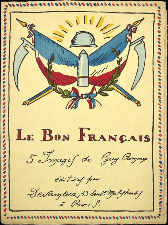 5 planches illustrées au pochoir et légendées : "Le Bon français ... se bat pour son pays, travaille pour nos soldats, cultive la terre, assure la reprise des affaires, souscrit à l'emprunt et échange son or contre des Bons de la Défense Nationale".Chaque planche est encadrée en bleu, blanc, rouge.Parfait état.