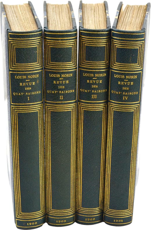 Louis Morin, La revue des Quat'Saisons - n°1 à 4. Paris, Ollendorff, 1900-1901. 4 volumes in-12, 326p. Ensemble complet des 4 numéros parus, un des 150 exemplaires du tirage de tête, n°58, un des 100 japon (les 50 autres étant sur chine), chaque numéro étant justifié. Morin présent ainsi sa revue : « Cette revue ne sera ni pessimiste, ni réaliste, ni grave, comme la plupart de ses consoeurs. L'art n'est-il pas un jeu, le jeu des bons esprits, qu'il faut ranger au nombre des choses pas bien sérieuses dont parle Renan ? La fantaisiste revue des Quat'Saisons tâchera d'y jouer légèrement, pour le passe-temps des gens décidés d'y jouer légèrement, pour le passe-temps des gens décidés à lutter contre le spleen qui nous envahit, et à arrêter le moins possible leur pensée sur les misères de la vie laide que nous font les lois, les préjugés, les modes et le snobisme » (p.1). Il y évoque : Les souvenirs des deux derniers quat'zarts et d'un bal du courrier français, Le bal de l'internat, Les fantaisistes à l'Exposition (Exposition universelle de 1900), La joie d'autrefois (Le soir de Venise), l'influence du Chat Noir, La mode, Les fêtes de caractère, Les danses d'Espagne et les danses d'Orient, Mme Sada Yacco, Cléo de Mérode et les danseurs du diable, L'heure du berger Terpsichore, La rue des Enfants, Le soir de Venise, La bourgeoisie marche, L'Art moderne sculpture (Le raid Rodin), Montmartre (Histoires de modèles), L'amour de l'art, Carnaval de Nice, Les masques rouges.. L'ouvrage est illustré par Louis Morin, de 400 dessins et 28 planches, en noir et en couleurs, certaines planches sont dépliantes. Demi-chagrin brun à coins, dos lisse orné, tête dorée, couvertures et dos conservés. Quelques petites épidermures aux coiffes inférieures et à un coin. Très bel exemplaire.