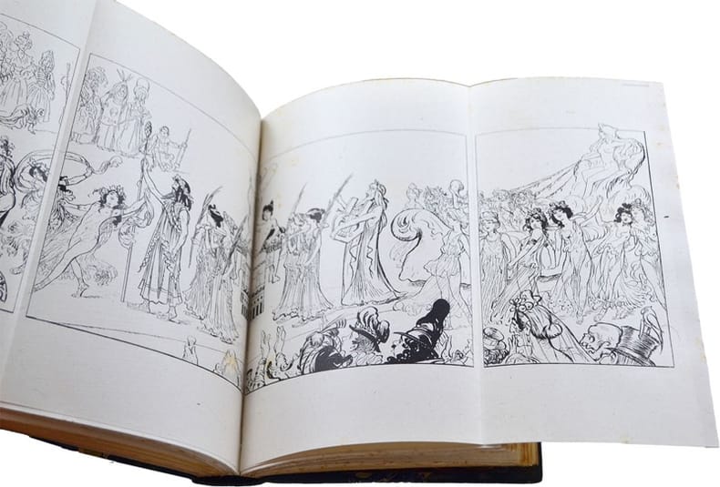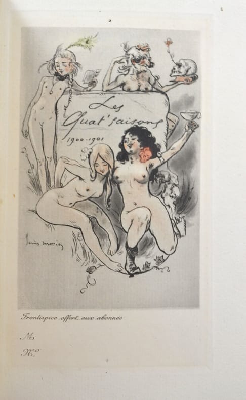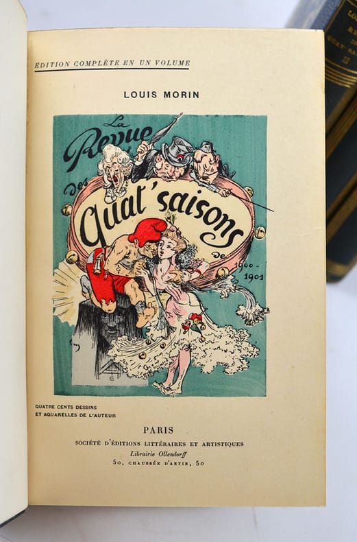 Paris, Ollendorff, Paris, Ollendorff1900-1901 ; 4 parties en 1 volume in-12, bradel, demi-percaline verte, pièce de titre en maroquin noir. 320 pp., 1 f. de table, 1 f. d’achevé d’imprimer.“Spirituelle publication recherchée. Elle est consacrée aux bals des Quat’zarts, aux fêtes, au Carnaval de Nice” dit Carteret IV p. 294. Environs 400 illustrations de l’artiste-auteur in ou hors-texte, certaines dépliantes et coloriées.Louis Morin (Paris 1855-Migennes 1938), peintre, caricaturiste et auteur, fut le fondateur de la Société des dessinateurs humoristes. Voir Osterwalder I, pp. 718-719 - Catherine Saint-Martin. 5000 dessinateurs de presse pp. 455-456 : “Morin fonde et dirige le trimestriel Revue des Quat’saisons en janvier 1900, sorte de livre de poche écrit et dessiné en couleurs”.