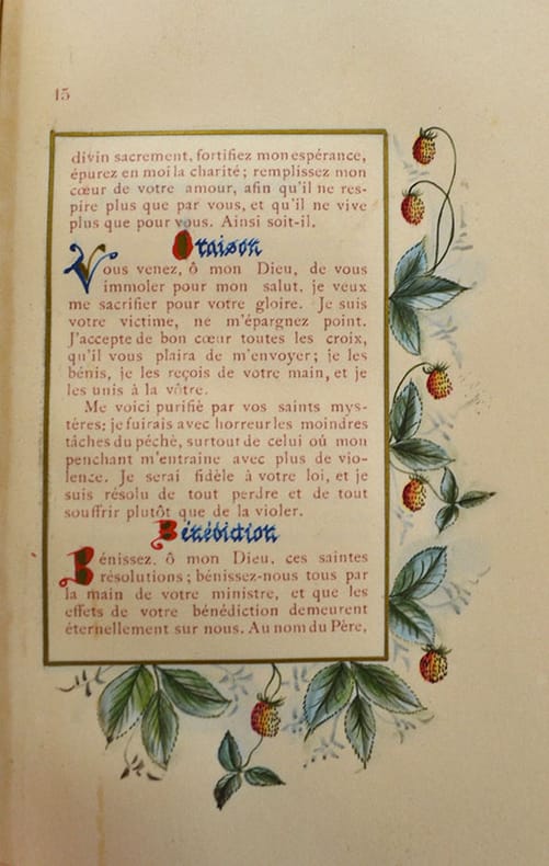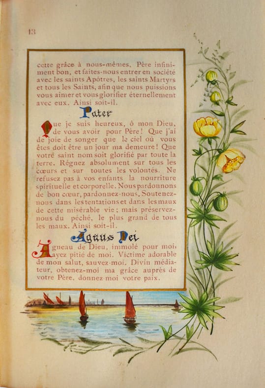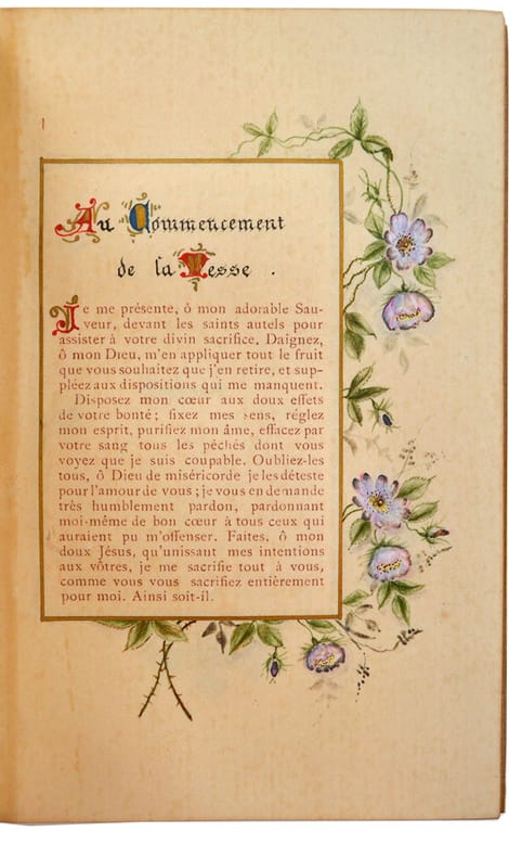 Livre de prières offert à l'occasion d'une cérémonie religieuse célébrée le 18 novembre 1907. "A Mademoiselle Jacqueline de Las Cases. Vœux de bonheur et sincères félicitations".Page de titre rehaussée à l'or, suivi du texte imprimé en rouge avec rehauts des titres et lettrines en rouge, bleu et or, dans un encadrement à l'or. Chaque page est enrichie d'un encadrement peint à la main alternant entre un trio de fleur-de-lys à l'or et un fin décor végétal aquarellé. Le texte est imprimé sur vélin.La famille de Las Cases est une famille de la noblesse française dont les plus anciennes preuves remontent au XVIe siècle. Décoloration au dos et aux bords supérieurs des plats.