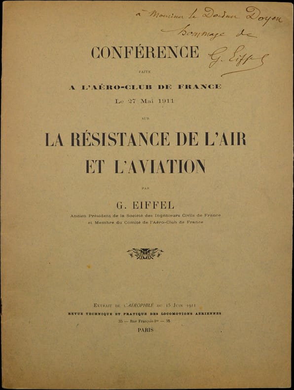 Édition originale de cette conférence à l’Aéro-Club de France dont il est membre du comité de direction. Sa communication porte sur les résultats des travaux aérodynamiques qu’il a menés avec son équipe de 1903 à 1910.Plaquette enrichie d'un envoi autographe de Gustave Eiffel au Docteur Le Doyen.Eugène Louis Doyen est un chirurgien français de renommée internationale, cité par l'écrivain russe Mikhaïl Boulgakov, modèle du personnage de Cottard chez Marcel Proust, et vilipendé par Léon Daudet dans Les Morticoles sous les traits du Docteur Bradilin . On le considère comme l’un des rénovateurs de la chirurgie française de la fin du XIXe siècle. Il est également connu pour son apport à la balistique médico-légale (notamment par l'étude des vitesses de projectiles par photographie et cinématographie), en collaboration avec Gustave Eiffel.Les expériences d'Eiffel sur le résistance de l'air ont ouvert la voie aux souffleries ("Tunnel Eiffel") et ont ainsi jeté les bases de la construction aéronautique moderne.
