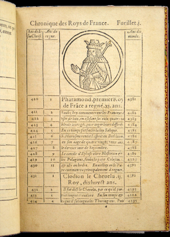 Rare édition originale de ce résumé chronologique de l'histoire de France composé par l'évêque Jean Du Tillet (150.-1570) et présenté sous la forme d'un tableau de 4 colonnes (Ans de Jésus Christ - Ans du règne - Description des événements - Ans du monde). Elle est complétée par le Catalogue des Papes et le Catalogue des Empereurs.L'illustration comprend cinq portraits en médaillon sur bois in-texte.Ex-libris J. Renard.Infimes frottements. Rousseurs sur le titre et sur la marque d'imprimeur au dernier feuillet.